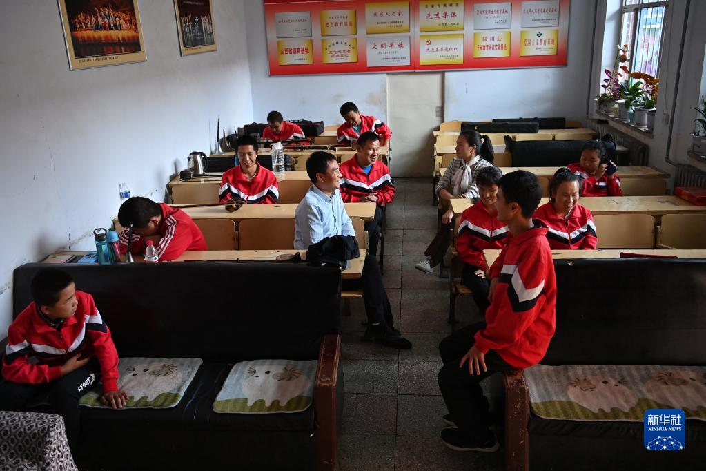 陵川縣盲人曲藝宣傳隊的隊員們在排練室聊天(9月15日攝)。