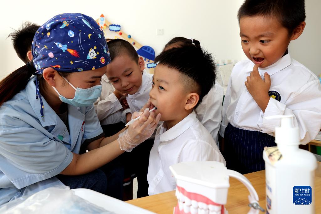 9月19日,在山東省棗莊市薛城區興安花園幼兒園,醫護人員在為小朋友檢查口腔健康狀況。