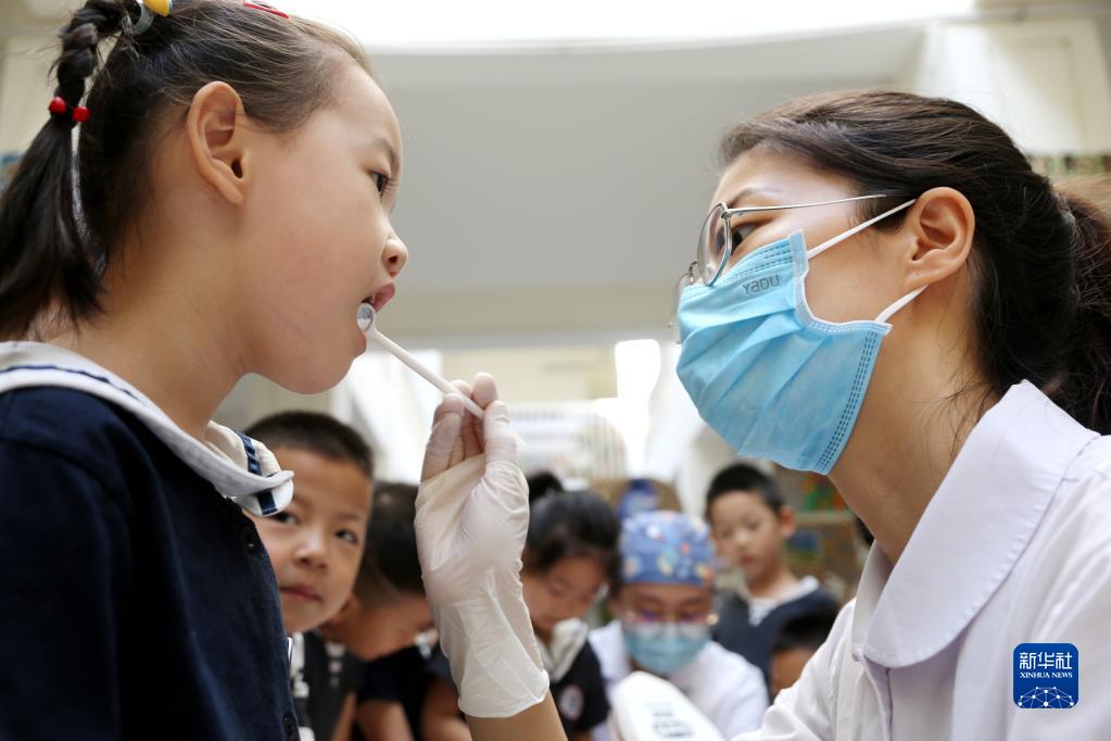 9月19日,在江蘇省連云港市核電鐘聲國際幼兒園,醫務(wù)人員給小朋友們檢查牙齒健康狀況。