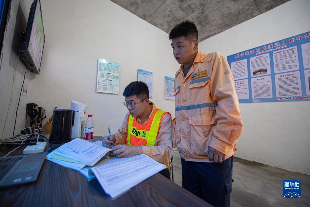 9月19日,看守員蔡金礦(右)在赤嶺隧道防洪值守點(diǎn)與看守員芮澎湃交接工作。