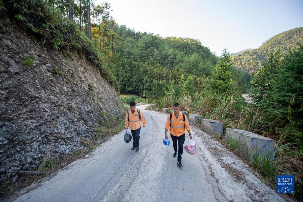 9月19日,看守員趙偉燈(右)與蔡金礦在前往赤嶺隧道防洪值守點(diǎn)的山路上行走。