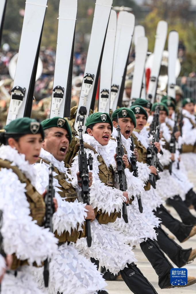 9月19日,在智利首都圣地亞哥,陸軍山地師士兵在閱兵式上列隊行進(jìn)。
