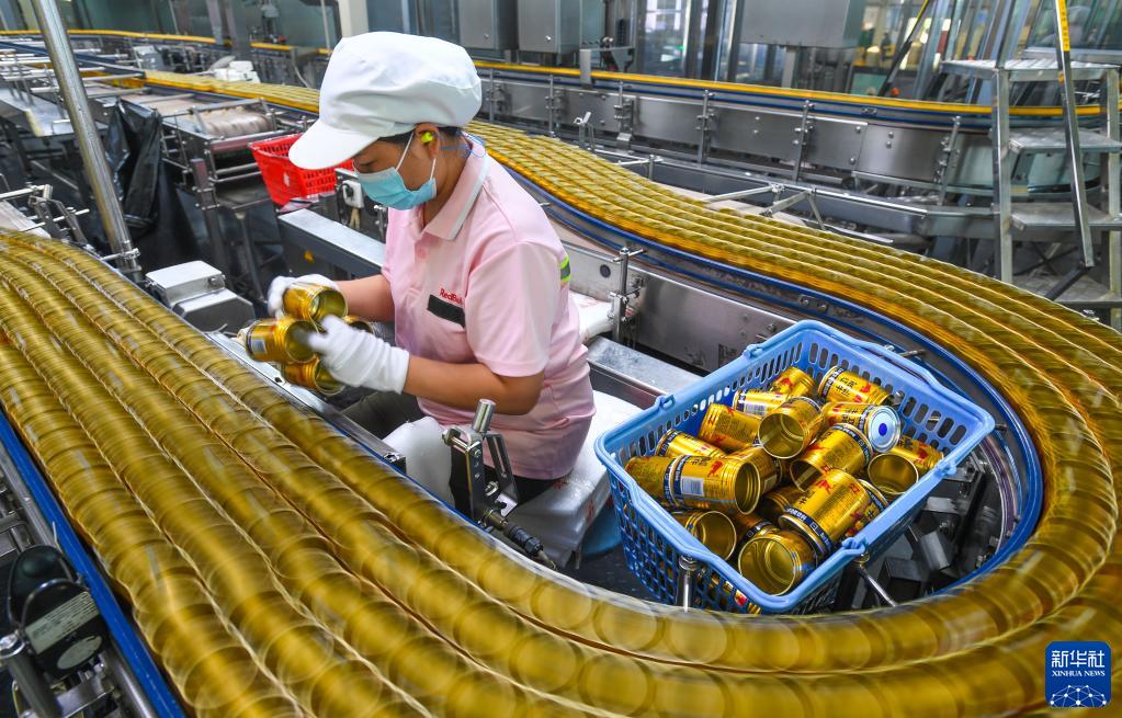 質(zhì)檢員在三水“水都基地”的紅牛維他命飲料公司灌裝生產(chǎn)線(xiàn)檢查罐體質(zhì)量(9月17日攝)。