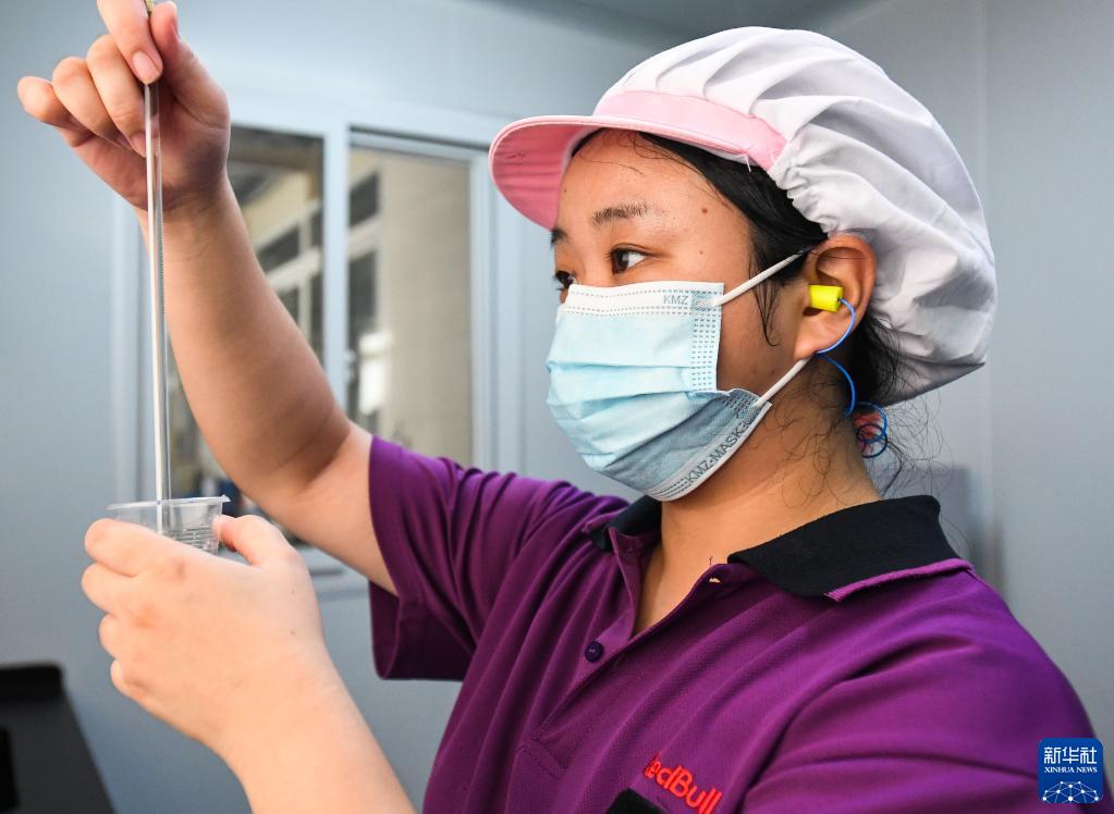 檢驗員在三水“水都基地”的紅牛維他命飲料公司車(chē)間抽檢產(chǎn)品糖度(9月17日攝)。