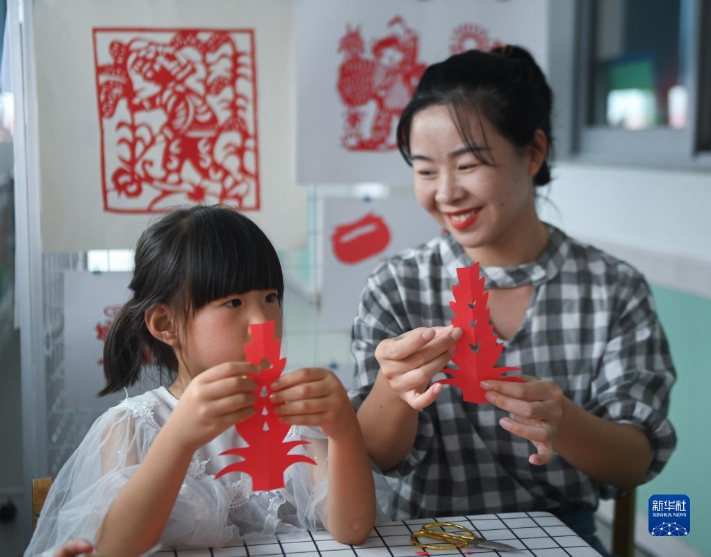 9月20日,老師指導小朋友剪出稻穗造型的剪紙作品。