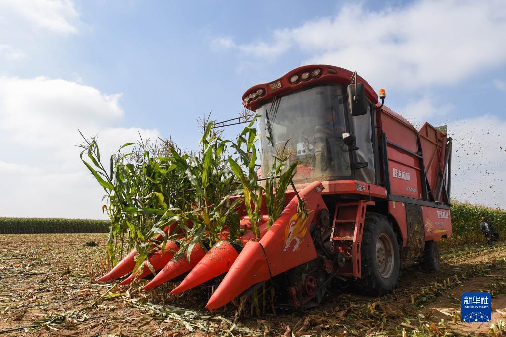 9月20日,在準格爾旗十二連城鄉康布爾村,農民駕駛農機收玉米。