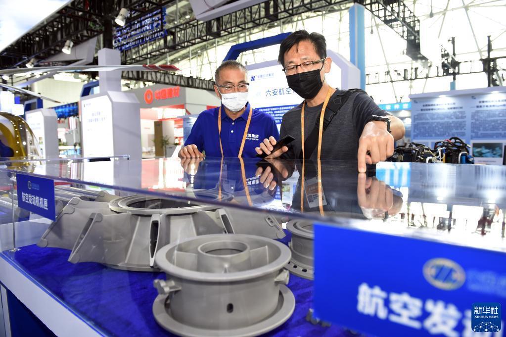 9月20日,在2022世界制造業(yè)大會(huì )上,工作人員向參觀(guān)者介紹展出的航空發(fā)動(dòng)機部件。