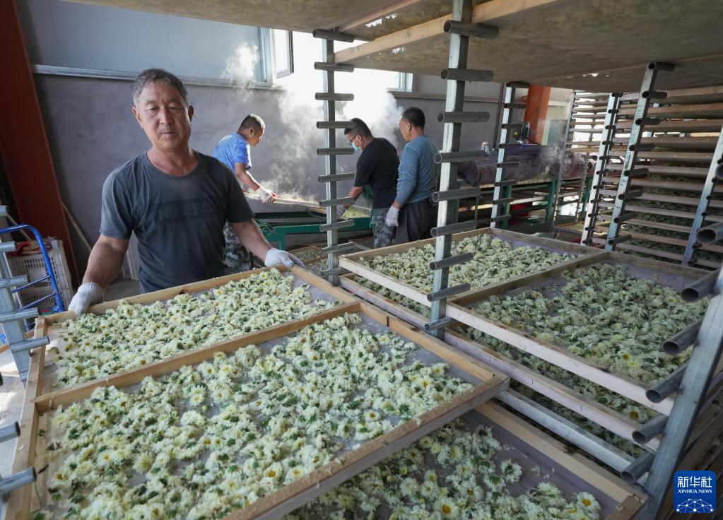 9月20日,石家莊市井陘礦區賈莊鎮中藥材加工企業(yè)工人將太行白菊裝盤(pán)烘干。