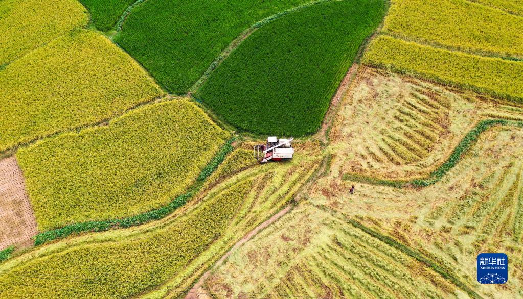 9月11日,在湖南省衡陽(yáng)市祁東縣永昌街道柞陂社區,農民駕駛收割機在收割水稻(無(wú)人機照片)。