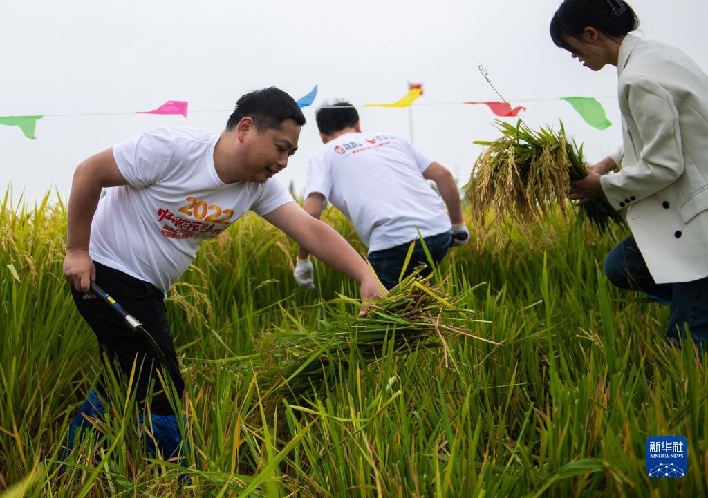 9月21日,在益陽(yáng)市南縣麻河口鎮東勝村,當地村民和游客在比拼收割水稻。