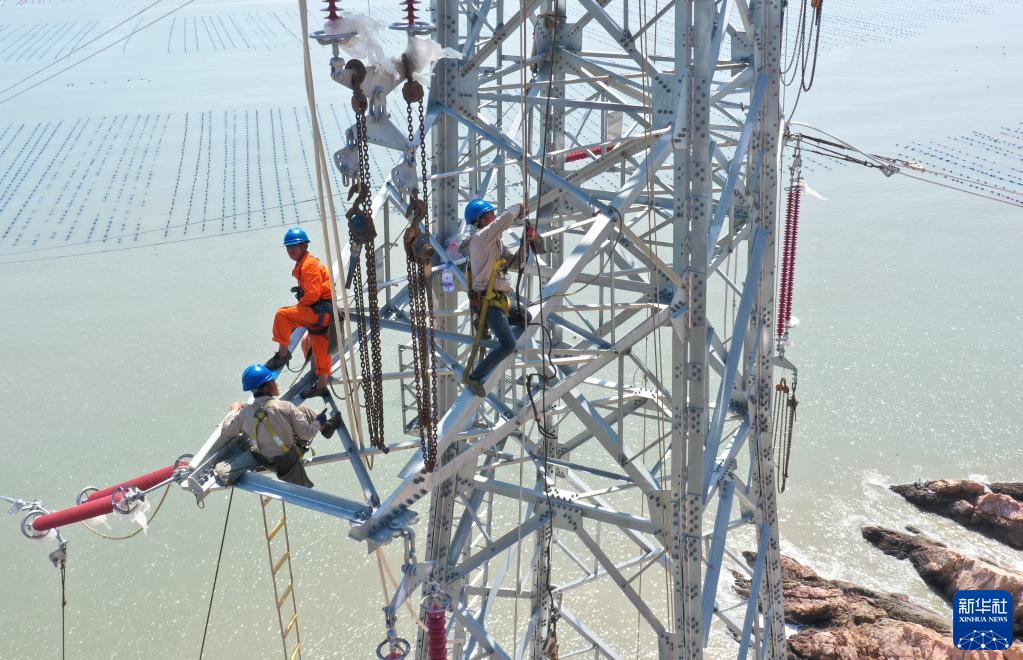 9月21日,國網(wǎng)福建省送變電工程有限公司施工人員在寧德市霞浦縣的B7塔處架線(xiàn)施工(無(wú)人機照片)。