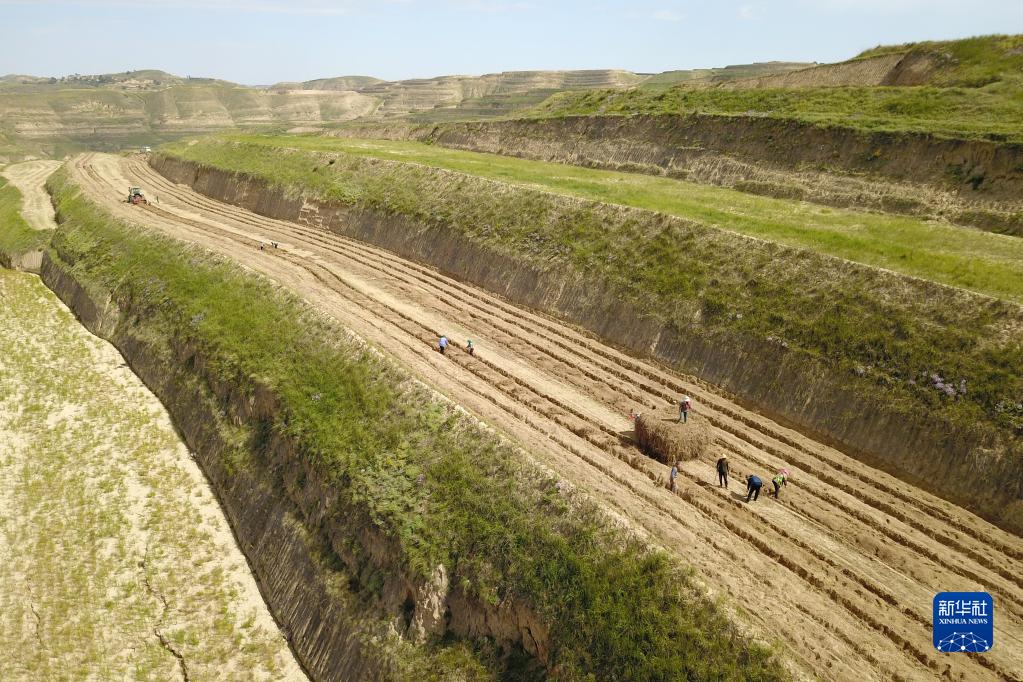 9月21日,農民在位于榆中縣貢井鎮的榆中宏鑫藥材專(zhuān)業(yè)合作社種植基地采收甘草(無(wú)人機照片)。