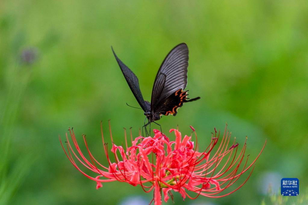 貴州省畢節市,一只蝴蝶停在花間(9月17日攝)。