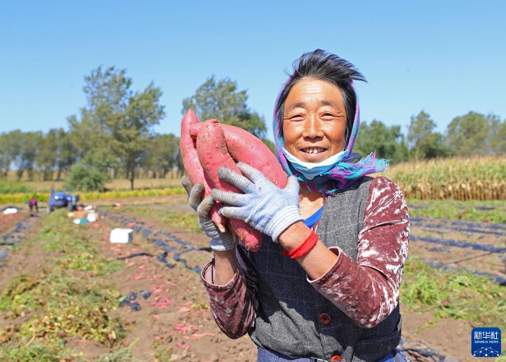 9月21日,在康平縣方家屯鎮十家子村,農民展示收獲的紅薯。