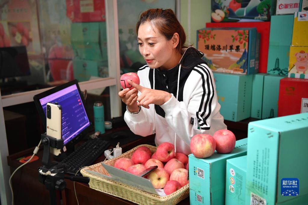 9月20日,在洛川縣一家果業(yè)公司的直播間內,工作人員直播銷(xiāo)售蘋(píng)果。