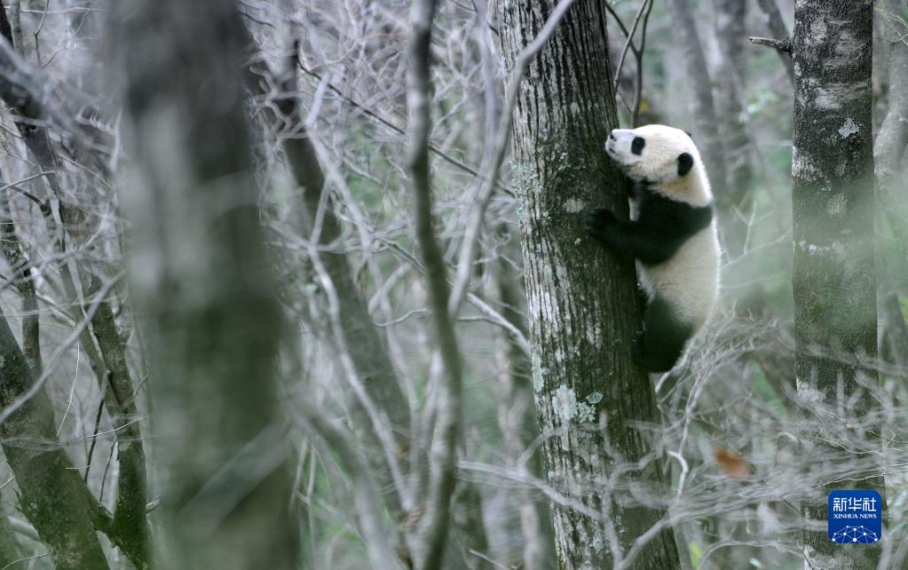 一只野生大熊貓幼崽在陜西漢中市佛坪縣岳壩鎮大古坪村攀登樹(shù)木(2016年3月28日攝)。大熊貓國家公園陜西片區主要分布在漢中市佛坪縣。豐富的植物物種及大面積的箭竹、木竹等竹類(lèi)資源,為大熊貓提供了穩定的食物來(lái)源。