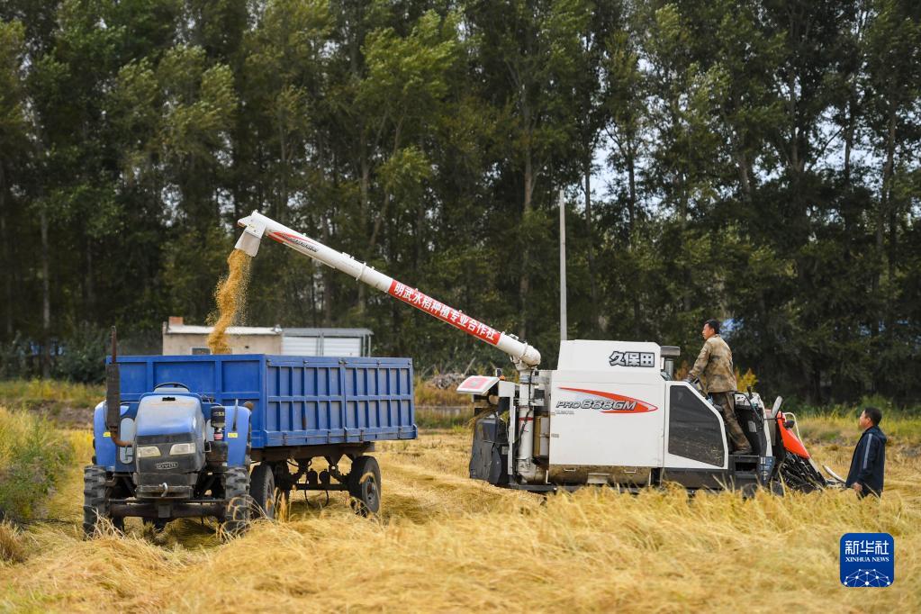 9月22日,內蒙古興安盟烏蘭浩特市義勒力特鎮的明武水稻種植專(zhuān)業(yè)合作社社員將收獲的稻谷裝入拖拉機。