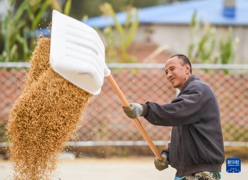 9月22日,內蒙古興安盟烏蘭浩特市義勒力特鎮的明武水稻種植專(zhuān)業(yè)合作社社員在晾曬水稻。