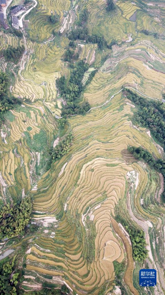 金秋時(shí)節,湖南省婁底市新化縣紫鵲界梯田的水稻進(jìn)入成熟收割期。紫鵲界梯田是世界灌溉工程遺產(chǎn)和全國首批19個(gè)重要農業(yè)文化遺產(chǎn)之一,梯田層層疊疊連綿起伏。