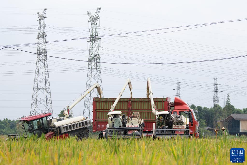 時(shí)值秋收,農業(yè)大省四川省各地農田里一片繁忙的收割景象。