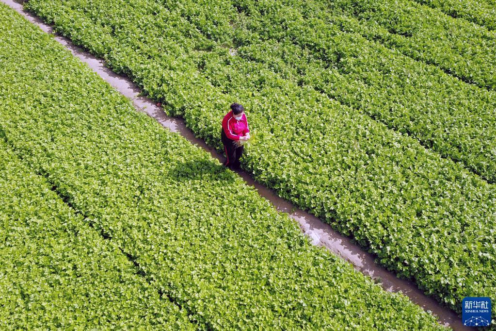 9月20日,在榆中祥龍蔬菜產(chǎn)銷(xiāo)專(zhuān)業(yè)合作社種植基地,豆俊蘭查看芹菜長(cháng)勢(無(wú)人機照片)。