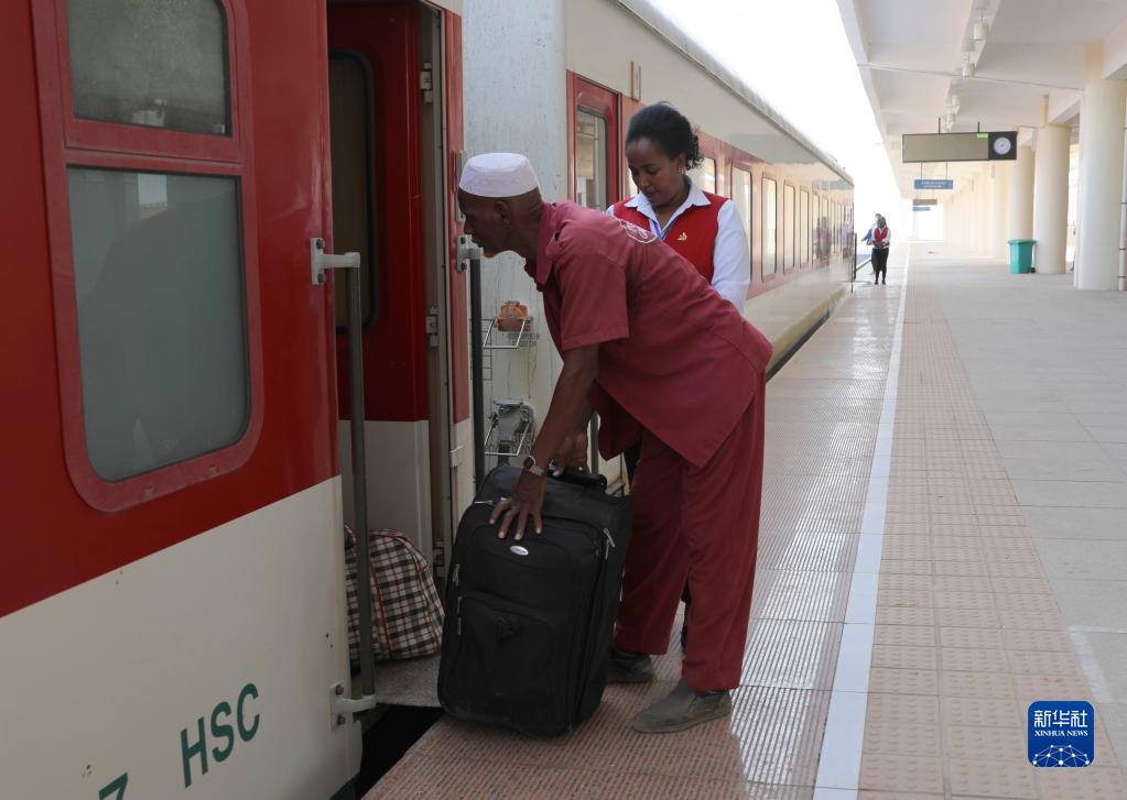 9月19日,在亞吉鐵路吉布提那噶德站,行李搬運工將乘客行李搬運上車(chē)。