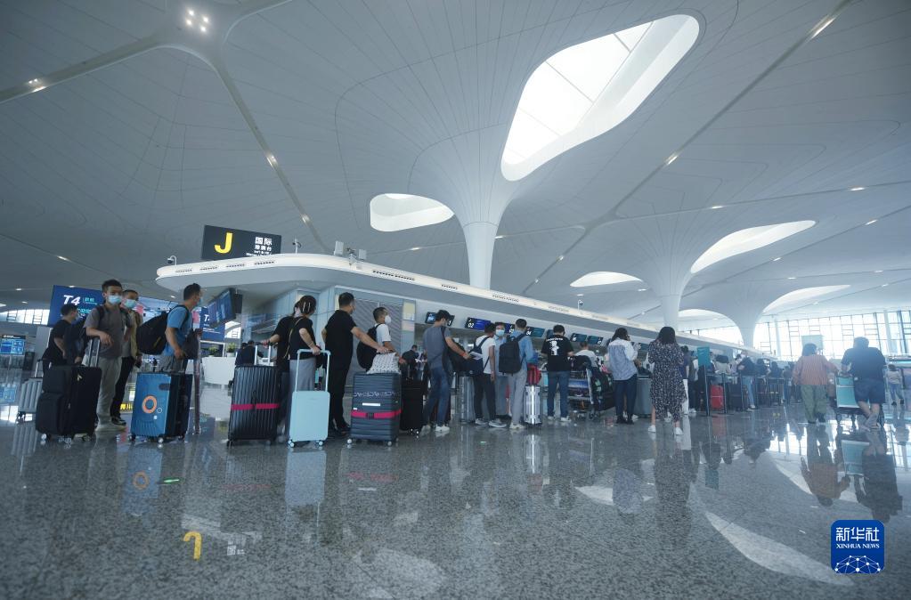 9月22日,旅客在杭州蕭山國際機場(chǎng)三期T4航站樓出發(fā)大廳排隊值機。
