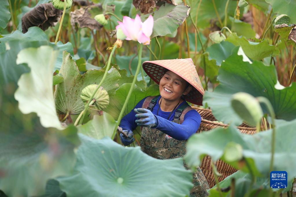 9月22日,在貴州省遵義市余慶縣子營(yíng)街道上里社區,村民在荷塘里采摘蓮蓬。