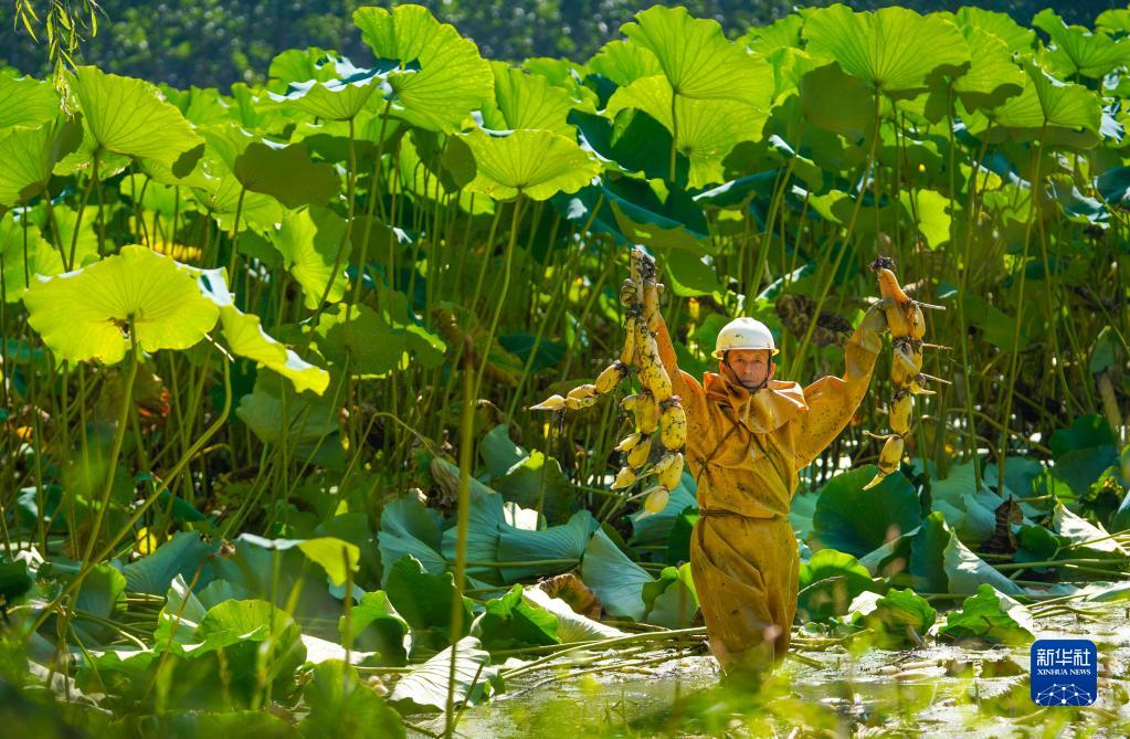 9月1日,在山東省鄒平市碼頭鎮大寨村,村民展示采收的蓮藕。