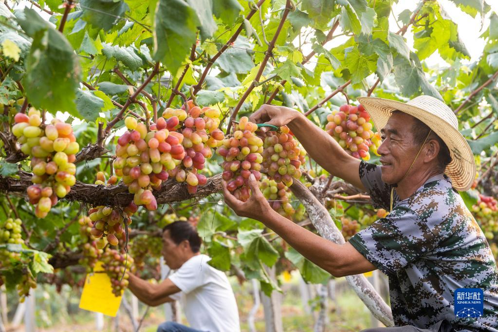 9月17日,在江蘇省昆山市巴城鎮一處葡萄園內,村民采摘葡萄。