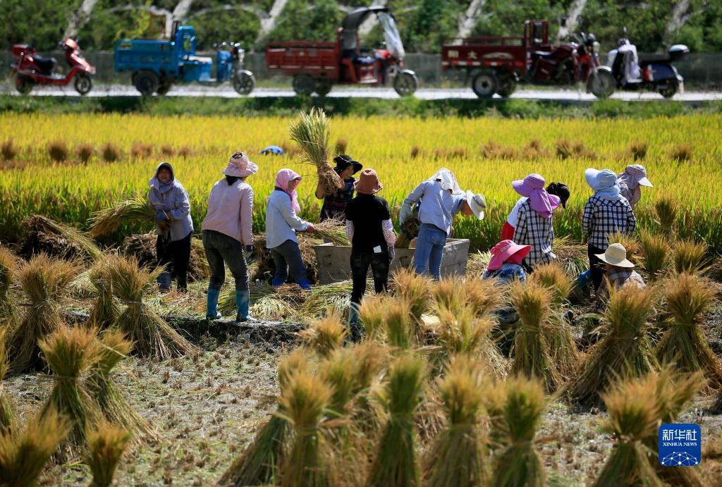9月21日,在甘肅省隴南市武都區石門(mén)鎮,村民們在收獲水稻。