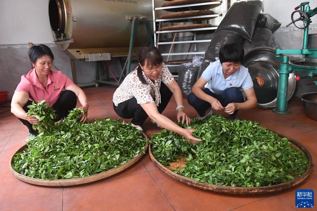 9月22日,在廣西蒼梧縣六堡鎮山坪村,村民在攤晾剛采摘回來(lái)的茶葉。