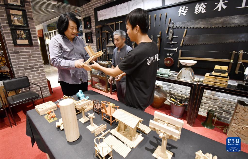 北京市朝陽(yáng)區非物質(zhì)文化遺產(chǎn)展館館長(cháng)徐偉(左)為市民講解傳統木工的榫卯結構(9月22日攝)。