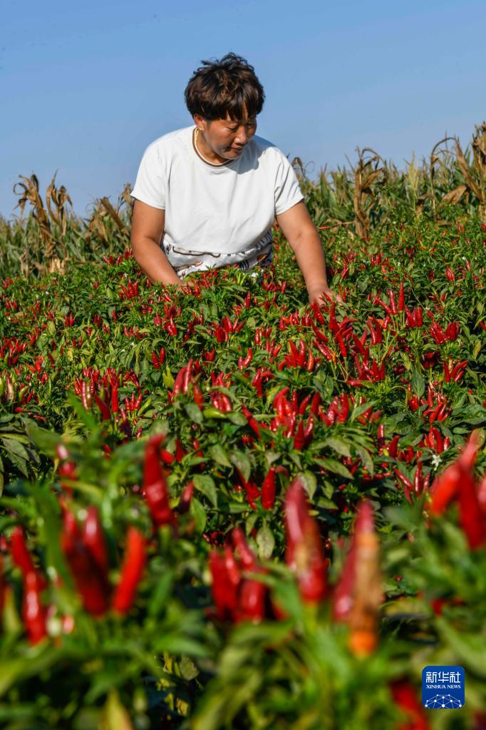 9月21日,在河北省唐山市玉田縣亮甲店鎮黃林村,“70后”張寶英在田間查看辣椒長(cháng)勢。2012年,張寶英牽頭成立了玉田縣寶英蔬菜種植農民專(zhuān)業(yè)合作社。如今,辣椒種面積由最初的700多畝增加到了2000多畝。