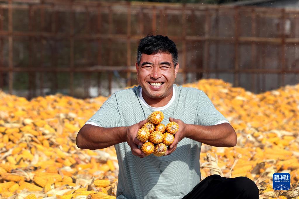 9月22日,在河南焦作博愛(ài)縣磨頭鎮崔莊村,“70后”崔衛民展示今年豐收的玉米。2016年,崔衛民流轉土地600畝,經(jīng)過(guò)6年辛勤耕耘,流轉土地達到1200畝。同時(shí),他每年還收購周邊40個(gè)村莊6000多畝的糧食作物。