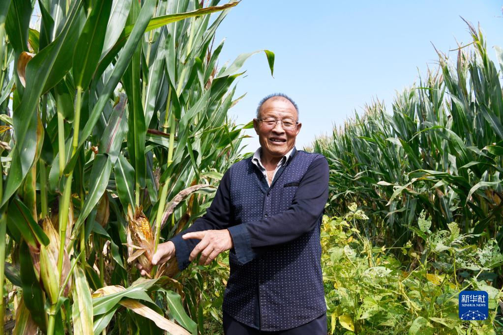 9月22日,在山東棗莊山亭區城頭鎮江時(shí)村,“40后”農民江哲建手指自家即將收獲的帶狀復合種植的玉米。農民江哲建今年帶頭推廣大豆玉米帶狀復合種植技術(shù)。近日,他家的160畝玉米大豆長(cháng)勢良好。