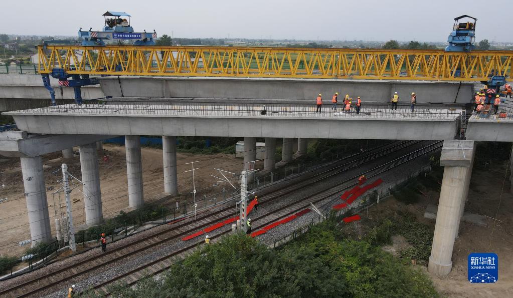 9月23日拍攝的蕪合高速公路上跨淮南鐵路箱梁架設施工現場(chǎng)(無(wú)人機照片)。