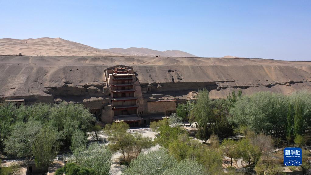 這是世界文化遺產(chǎn)莫高窟的標志性建筑——第96窟窟外木構建筑九層樓(2022年4月18日攝,無(wú)人機照片)。新華社記者 陳斌 攝