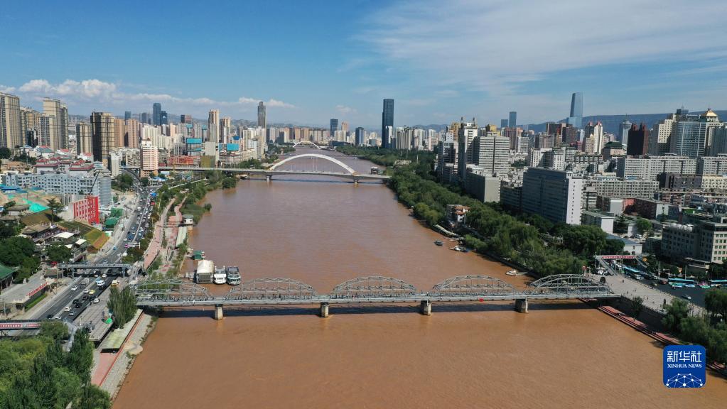 這是黃河蘭州段城市風(fēng)光(2022年9月5日攝,無(wú)人機照片)。新華社記者 陳斌 攝