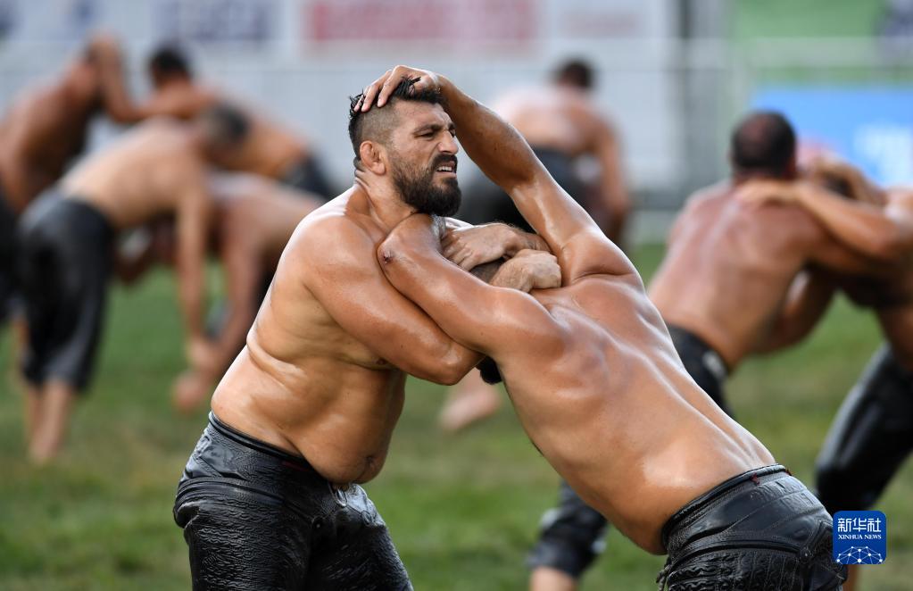 9月18日,選手們在土耳其伊斯坦布爾參加傳統的橄欖油摔跤比賽。