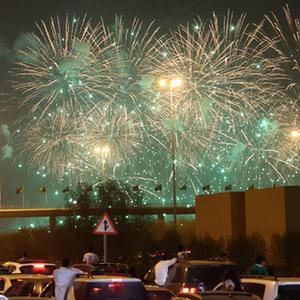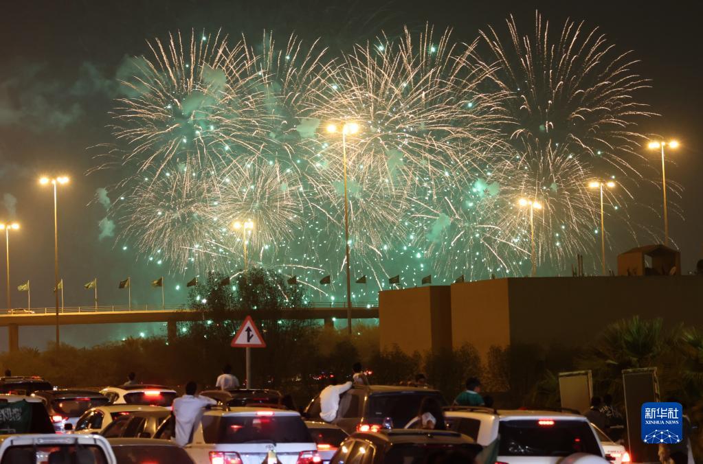 當日,沙特多地燃放煙花,慶祝國慶日。
