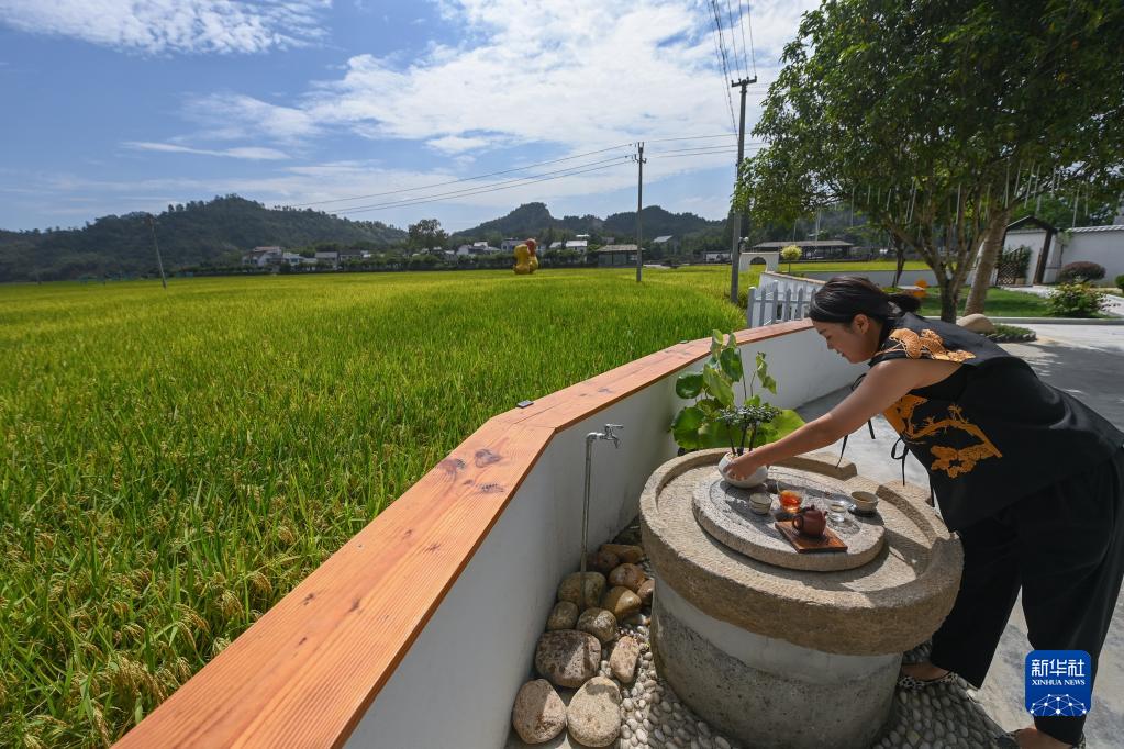 9月24日,羅虹在太陽(yáng)鎮太陽(yáng)村稻田邊的“稻香別院”特色餐廳院子內擺放茶具。今年上半年羅虹與合伙人一起在太陽(yáng)鎮太陽(yáng)米稻田基地旁邊租下一幢空置的房屋,打造集田園觀(guān)光、休閑、餐飲為一體的稻香特色餐廳。