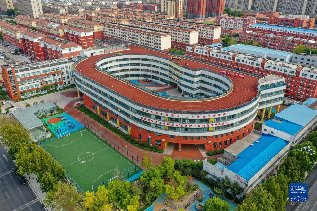這是9月20日拍攝的齊河縣第六小學(xué)(無(wú)人機照片)。這所地處鬧市的學(xué)校將地下停車(chē)、地上教學(xué)、運動(dòng)場(chǎng)地分層穿插布局巧妙融合,節地率達到54%。