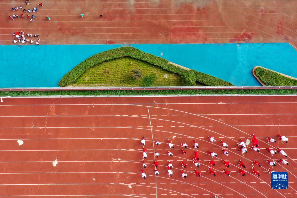 9月20日,齊河縣第六小學(xué)學(xué)生在空中運動(dòng)場(chǎng)上體育課(無(wú)人機照片)。這所地處鬧市的學(xué)校將地下停車(chē)、地上教學(xué)、運動(dòng)場(chǎng)地分層穿插布局巧妙融合,節地率達到54%。
