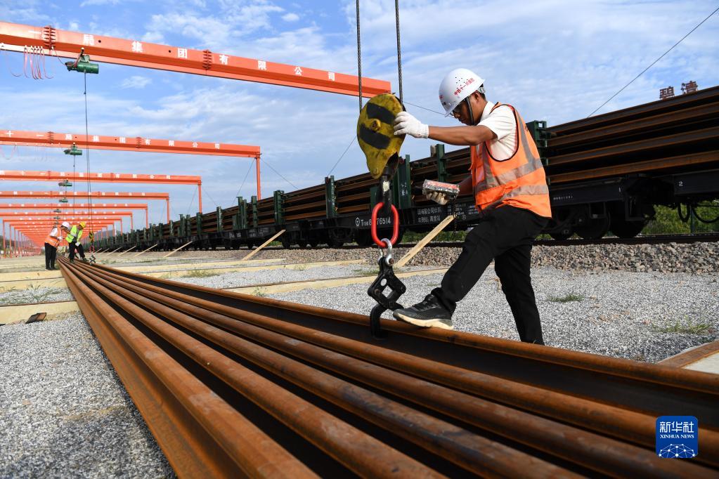 9月24日,在中鐵十一局池黃鐵路鋪軌基地,工作人員進(jìn)行卸軌作業(yè)。