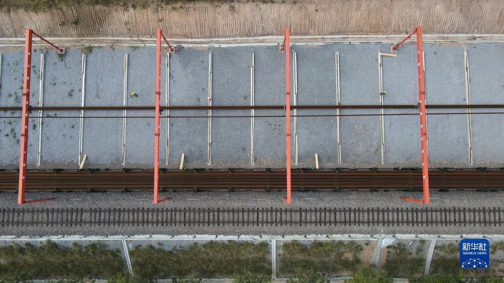 9月24日,在中鐵十一局池黃鐵路鋪軌基地,工作人員進(jìn)行卸軌作業(yè)(無(wú)人機照片)。