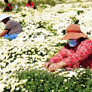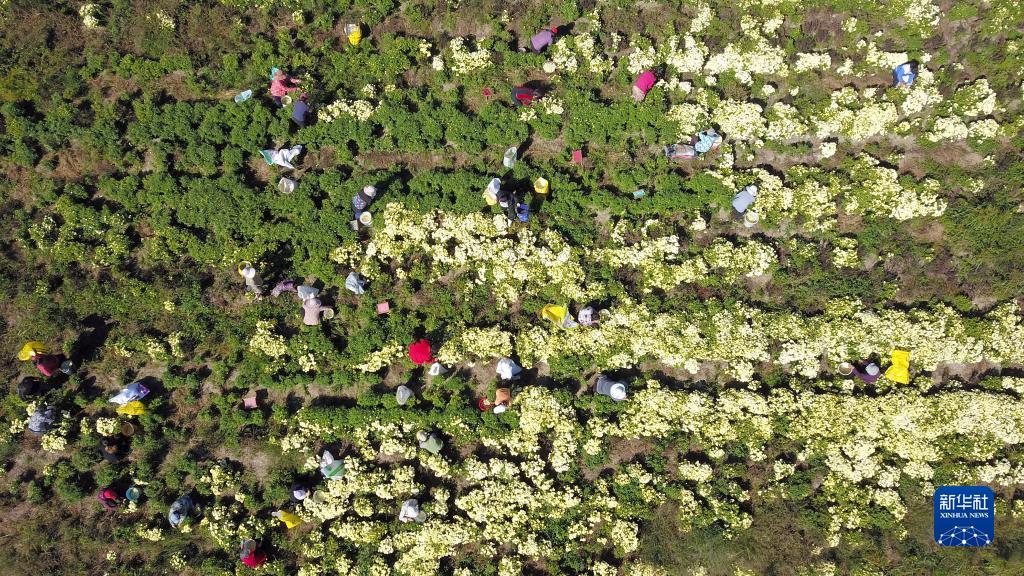 9月23日,在惠民縣姜樓鎮誠至農牧專(zhuān)業(yè)合作社,村民在采摘北京菊(無(wú)人機照片)。