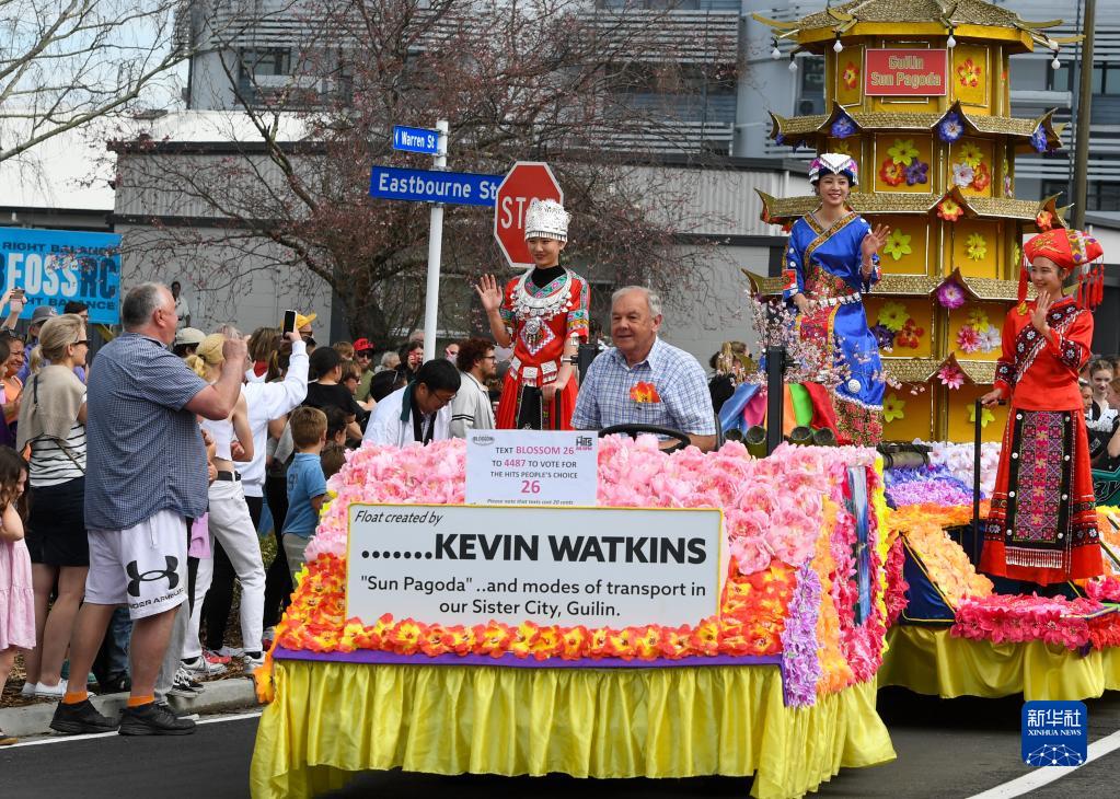 9月24日,在新西蘭黑斯廷斯,凱文·沃特金斯(前)駕駛自己的中國主題花車(chē)參加花車(chē)巡游活動(dòng)。