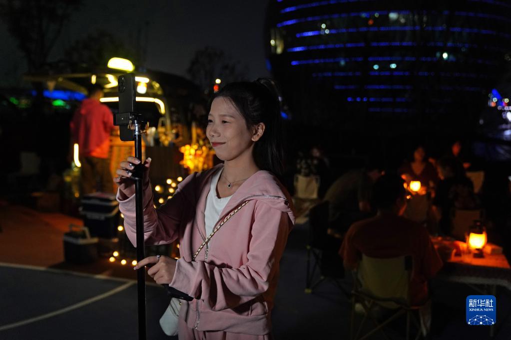 在南昌市紅谷灘區的一處空地,況美婷在小攤前做直播與網(wǎng)友互動(dòng)(9月22日攝)。