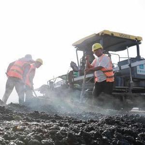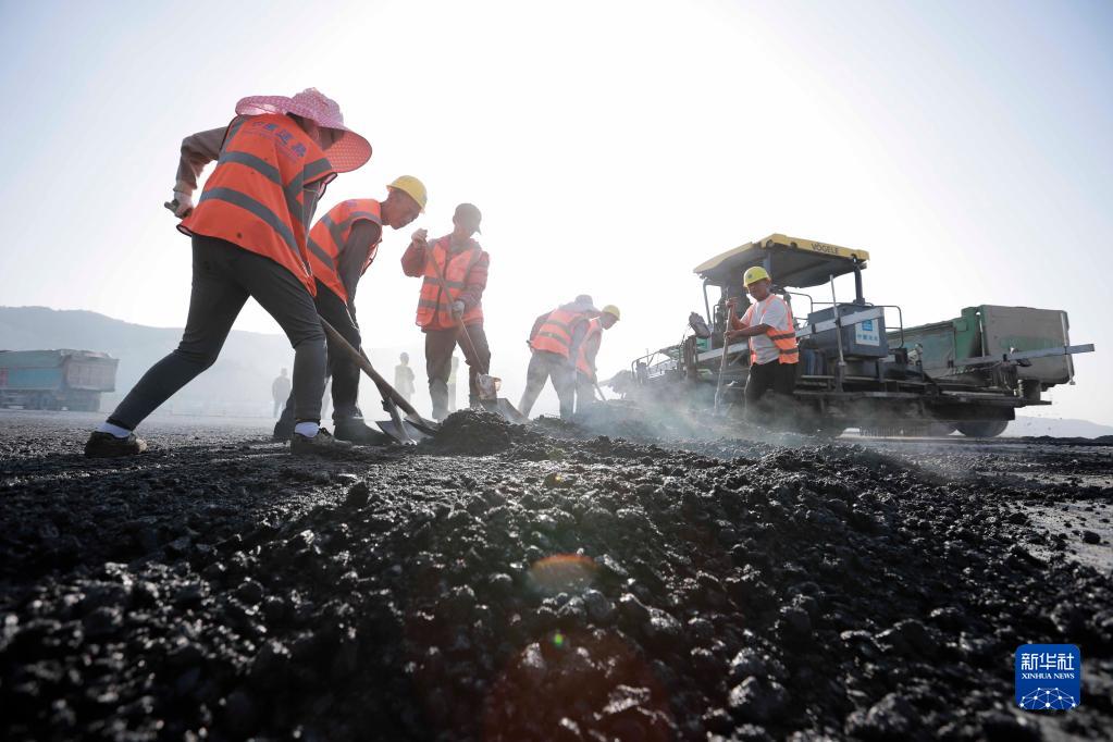 9月25日,工人在京秦高速遵秦段河北省遵化市境內進(jìn)行路面施工。